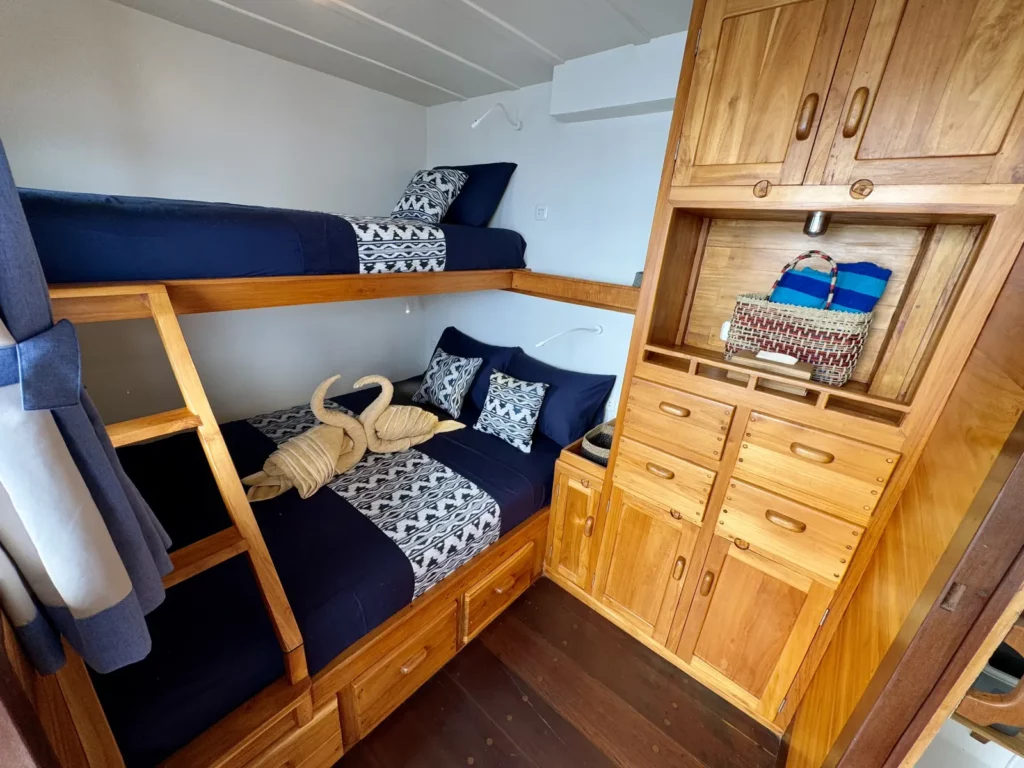 Bajau features two triple cabins (8 m²), each accommodating two guests. These cabins include a double bed (140 x 200 cm) and an upper bunk (90 x 200 cm), making them ideal for couples or families traveling with a child. Located on the main deck, they are well-insulated and protected from sun exposure. Additional amenities include a private bathroom, large window, desk, reading lights, 220V plugs, ample storage, towels, and eco-friendly toiletries, with daily cleaning service provided.