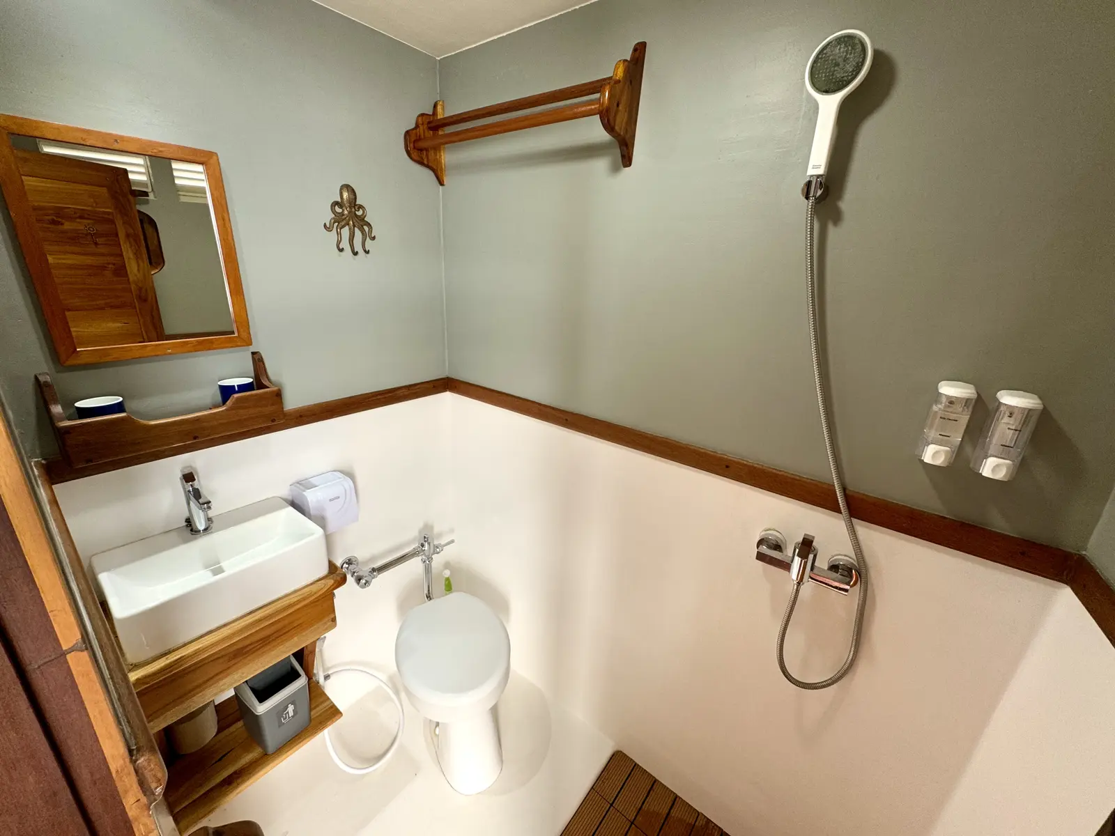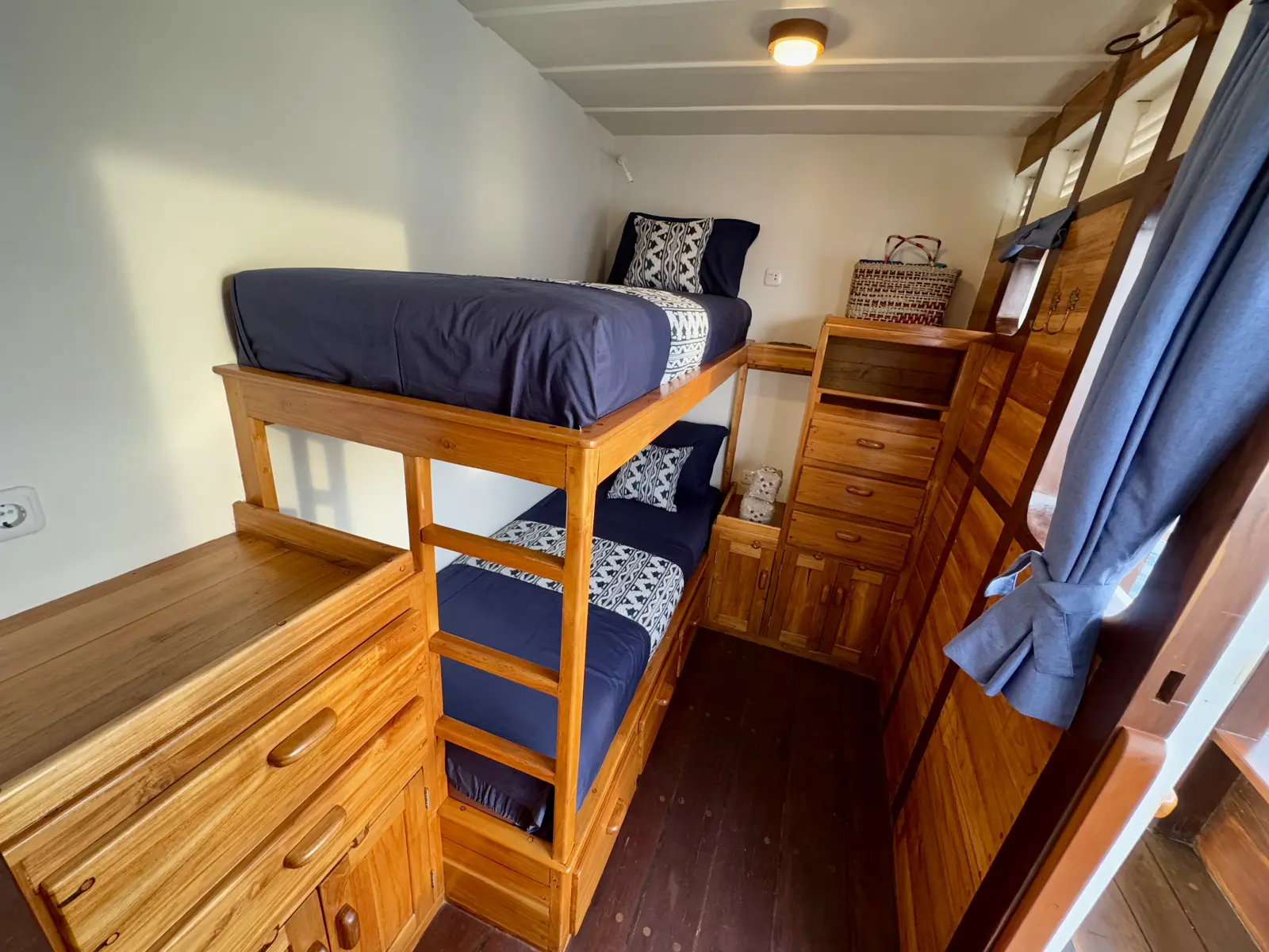 Bajau features two triple cabins (8 m²), each accommodating two guests. These cabins include a double bed (140 x 200 cm) and an upper bunk (90 x 200 cm), making them ideal for couples or families traveling with a child. Located on the main deck, they are well-insulated and protected from sun exposure. Additional amenities include a private bathroom, large window, desk, reading lights, 220V plugs, ample storage, towels, and eco-friendly toiletries, with daily cleaning service provided.