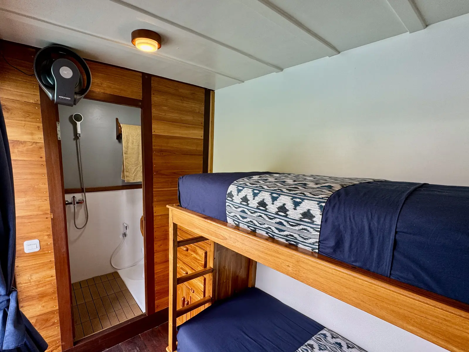 The two twin cabins (8 m²) offer a comfortable setup with two bunk beds (80 x 200 cm), perfect for friends or solo travelers. Like the triple cabins, they feature a private bathroom, large window, ceiling fans, a desk, reading lights, 220V plugs, ample storage, towels, and eco-friendly toiletries. Positioned on the main deck, they are naturally ventilated and thoughtfully designed for a relaxing stay.