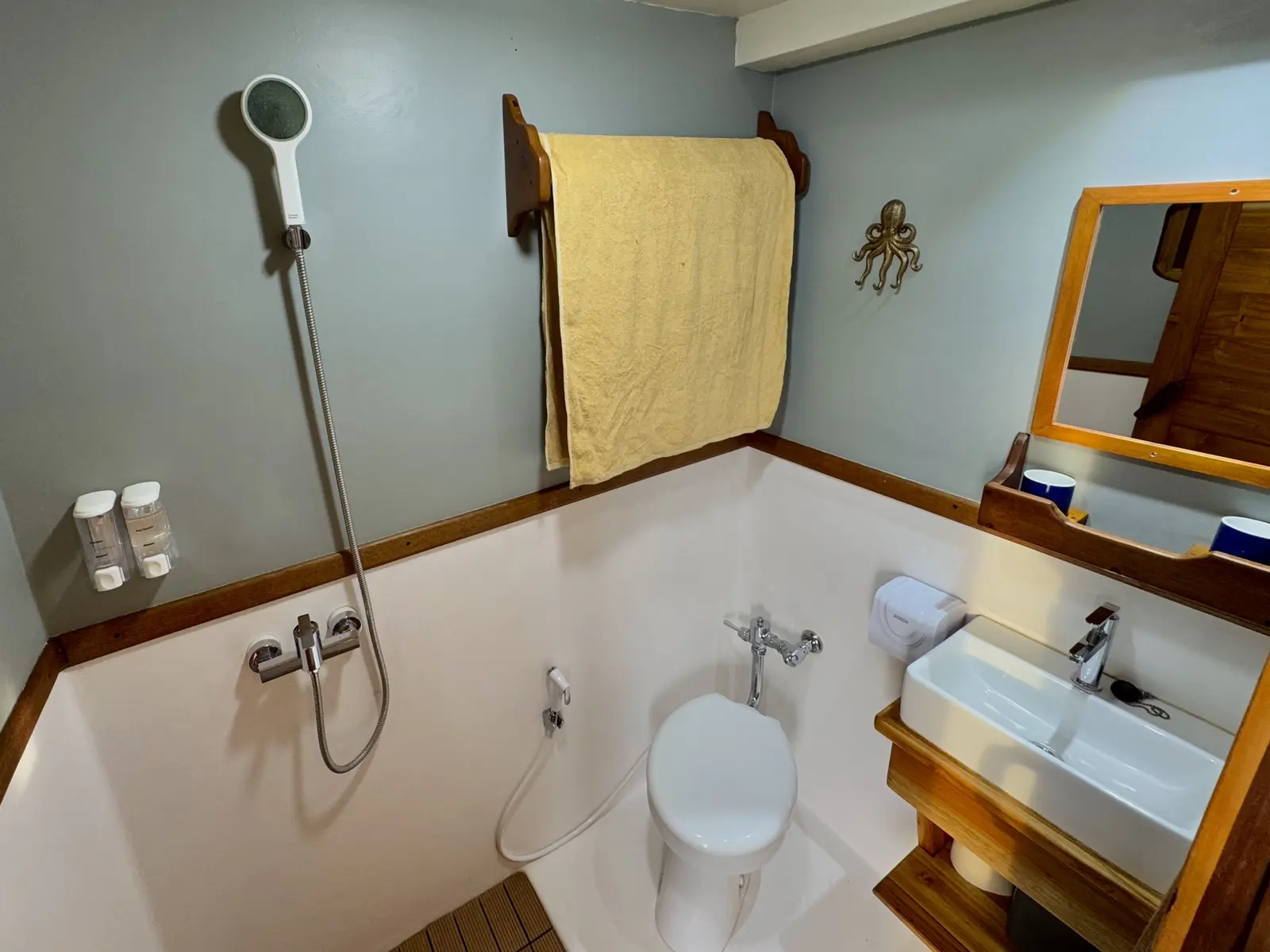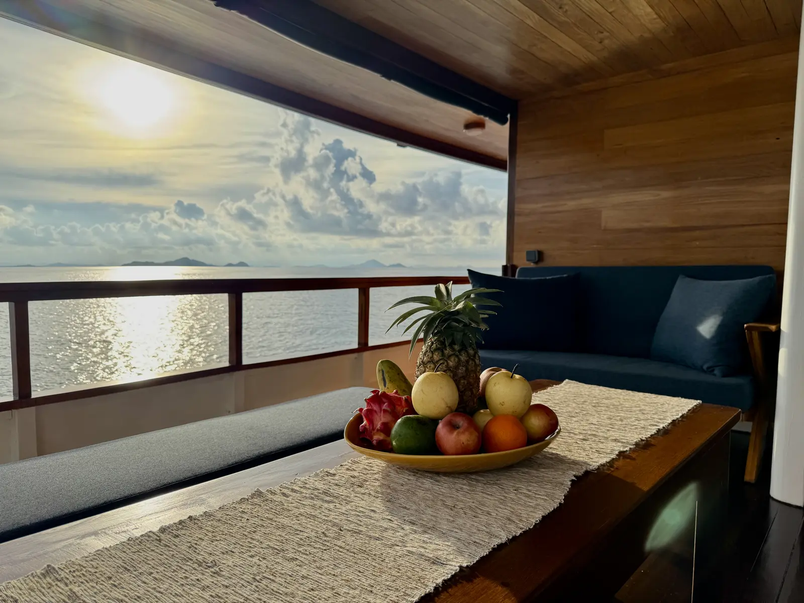 Bajau liveaboard is designed for travelers seeking comfort and sustainability while exploring Indonesia’s stunning waters. Built with natural ventilation and large windows for fresh air and ocean views, the boat provides a cozy and eco-friendly stay. Even there is no air conditioning onboard, the well-insulated cabins ensure a comfortable atmosphere, complemented by ceiling fans and thoughtful design.