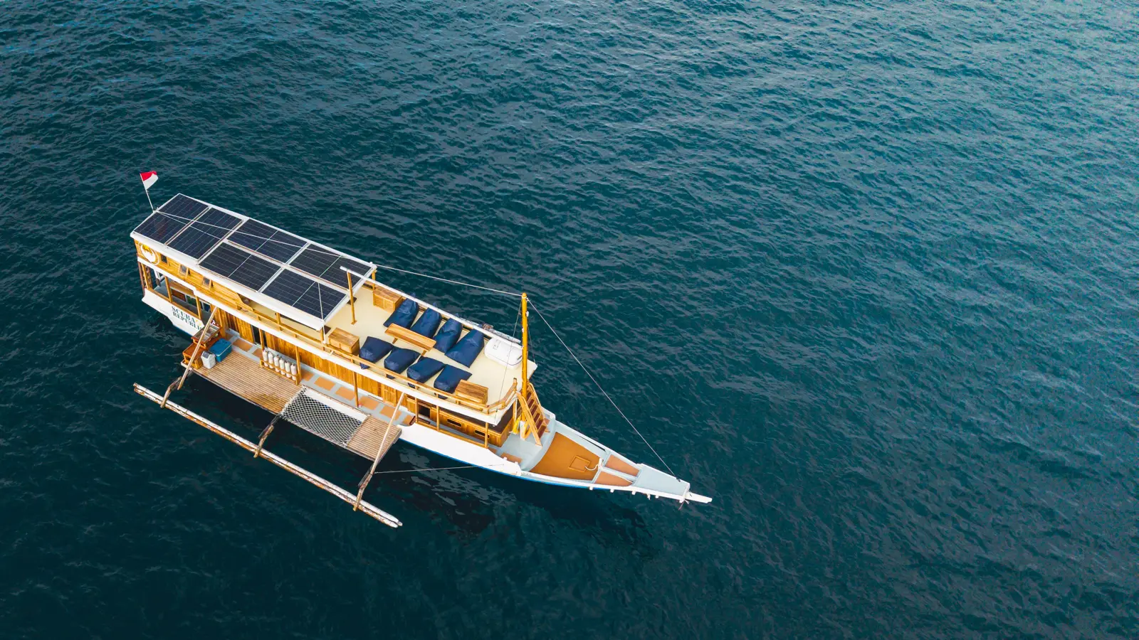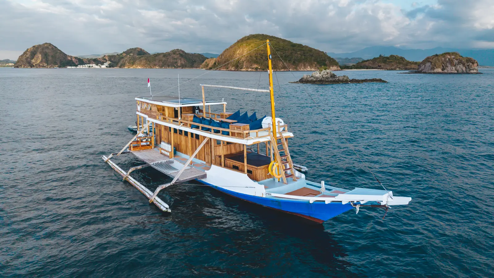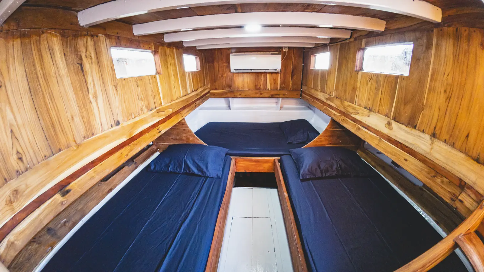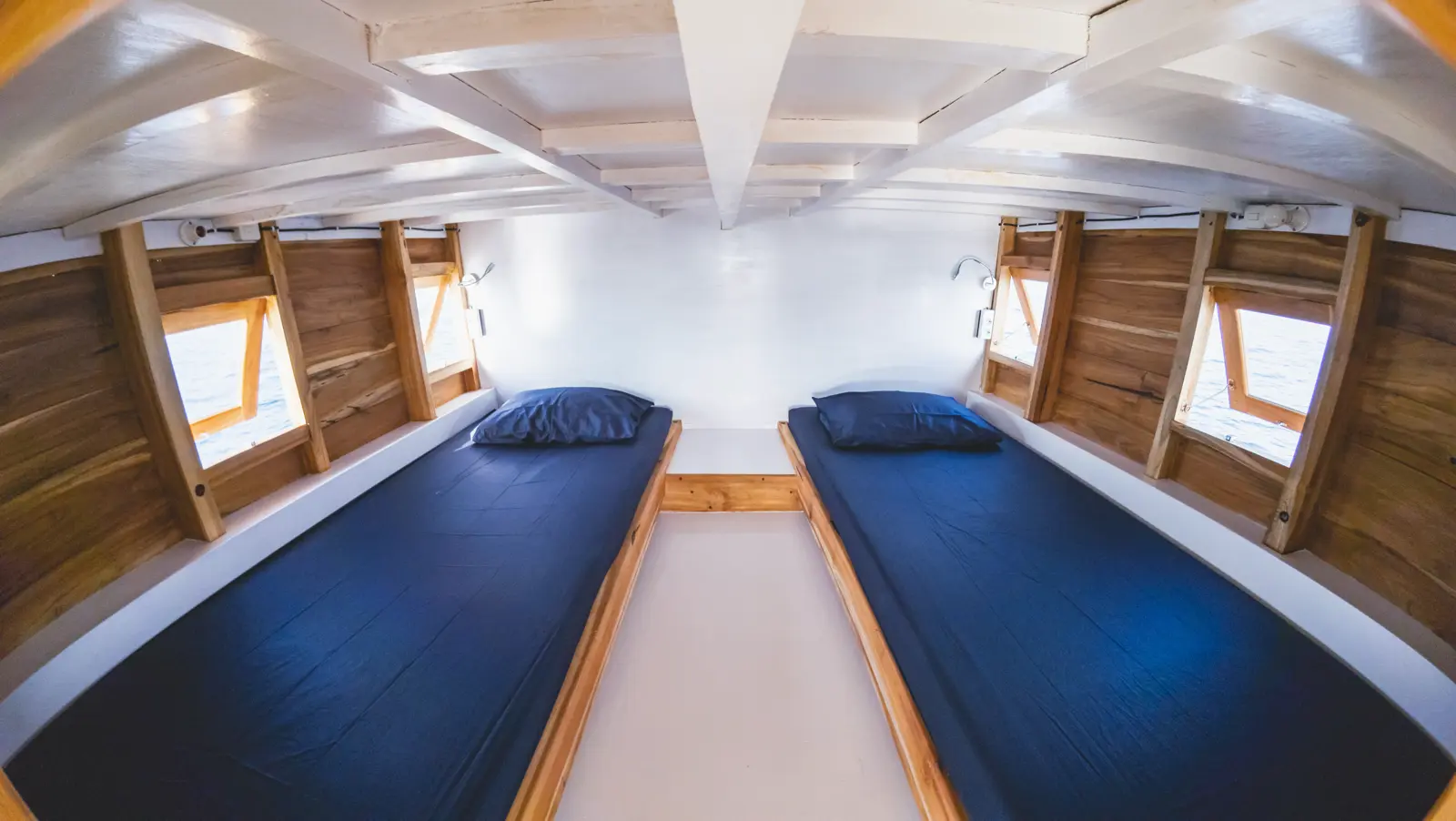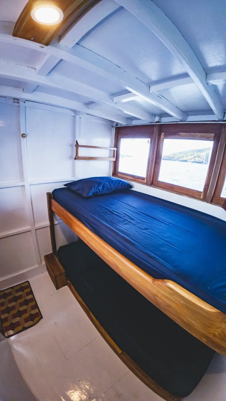 If you’re looking for a simple, laid-back boat to explore the underwater world of Komodo, Capoeng Liveaboard might be just what you need. Designed with divers in mind, Capoeng is all about comfort and functionality without losing its charm. The boat features two shared bunk-bed cabins, one twin cabin, and a cozy dorm-style room, perfect for solo travelers or small groups. Each bed has its own night light and charging point, and the shared bathroom comes with a western toilet and a wet-room style shower.
