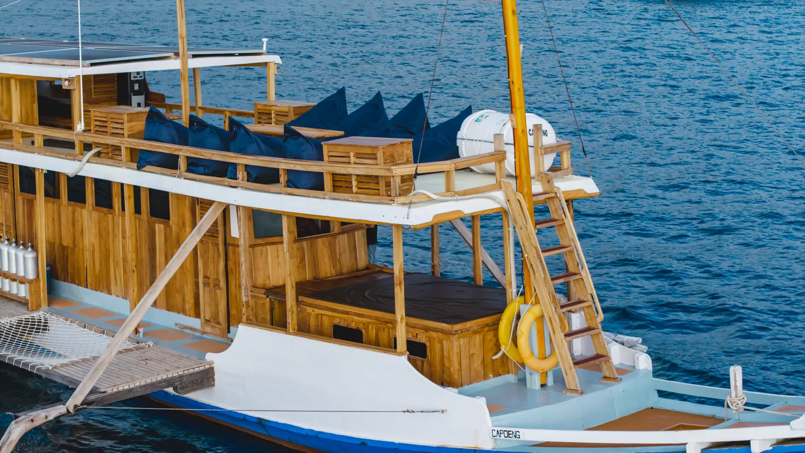 Life on board is easy and social. Between dives, you can relax on the open deck with beanbags or head up to the shaded top deck to take in the views. Meals are freshly prepared by our onboard chef and served family-style, a great way to connect with fellow travelers. Whether you’re sipping coffee at sunrise or sharing stories after a day in the water, Capoeng offers a warm, welcoming atmosphere for an unforgettable diving trip in Komodo.