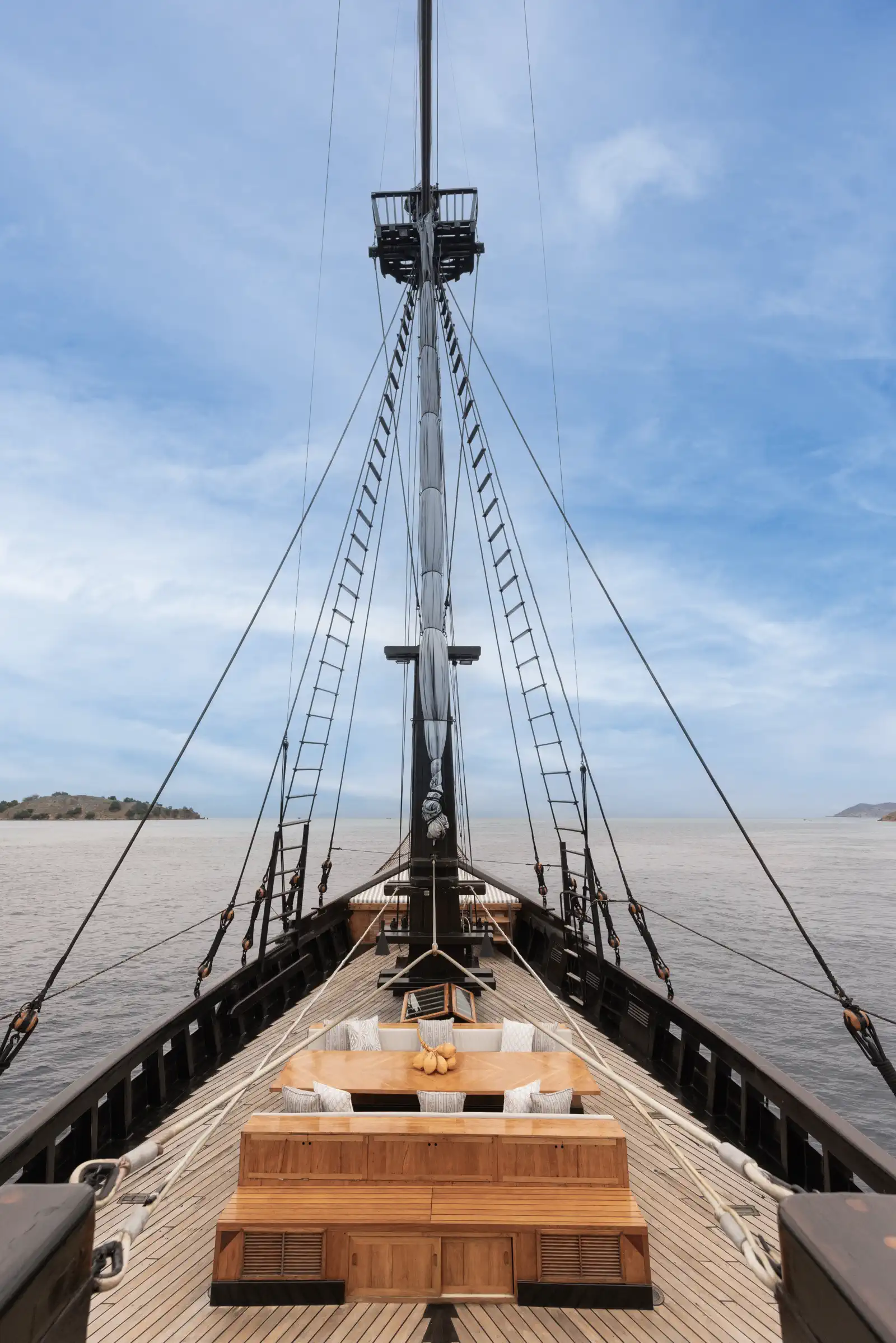 Built by hand in Serangan in 2008, this 39-meter phinisi reflects Indonesia’s wooden boatbuilding tradition with the scale and character of a classic yacht. With five cabins for up to ten travelers, El Aleph offers the exclusivity of a private charter enhanced by Rascal Voyages’ Archipelago Chic design, introduced in the 2025 refurbishment with lighter teak, handwoven textures, and curated antiques.