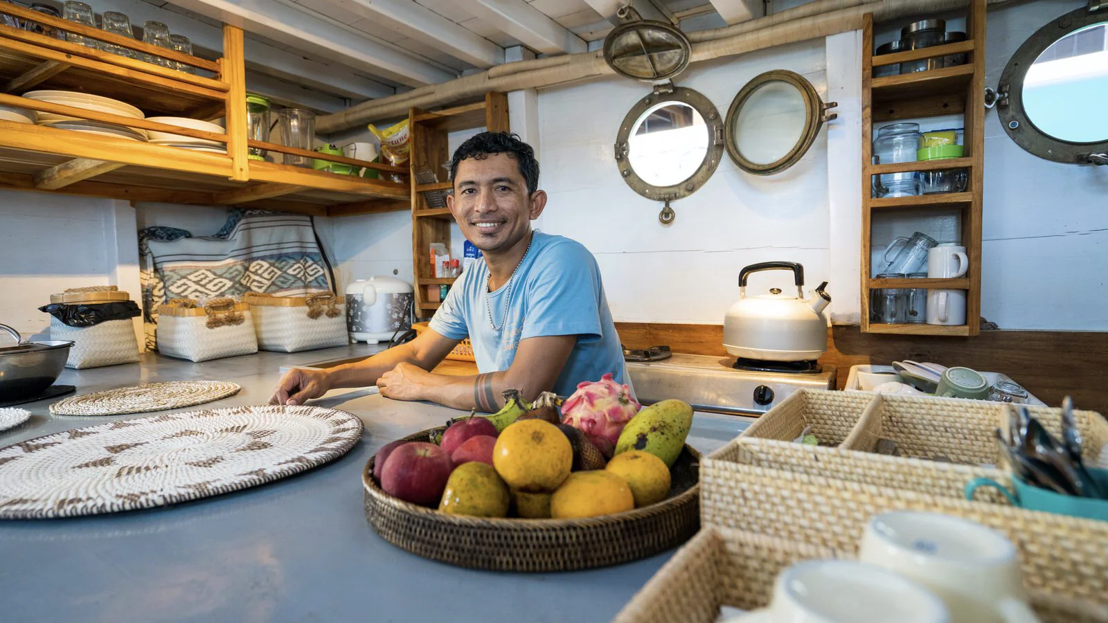 The Jinggo Janggo can accommodate up to 5 guests in 2 privrate cabins. The large deck is perfect to lounge, rest, and spend quality time between your activities. On the lower deck, you will find the kitchen and the cabins. At the back of the boat is the shared bathroom equipped with a shower, and toilet.