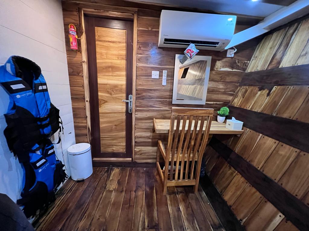 The most exclusive cabin onboard. It features large sea-view windows, an ensuite bathroom, and space for up to three guests with an extra bed.