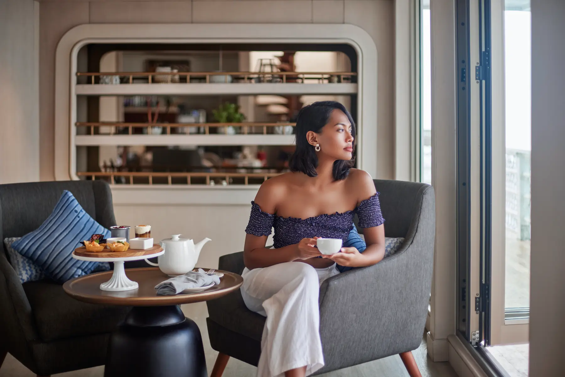 The Luxury Suite offers a beautifully appointed space with ocean views and either a queen or king bed depending on configuration. With soothing interiors, premium linens, and a contemporary ensuite bathroom, it provides an intimate setting for couples seeking comfort and style throughout their voyage.