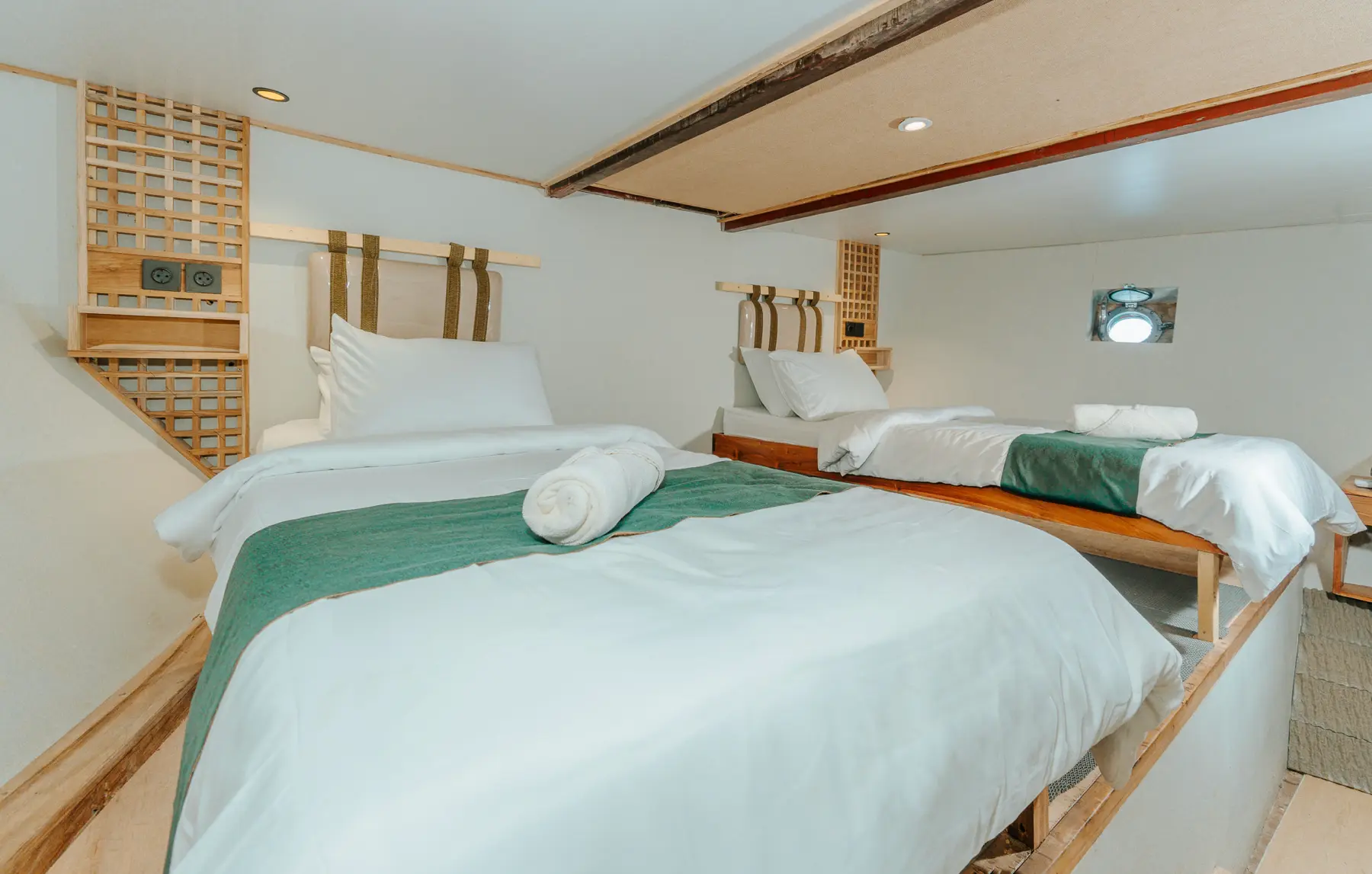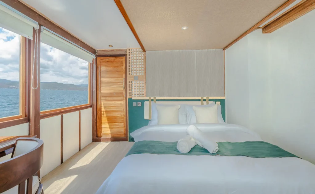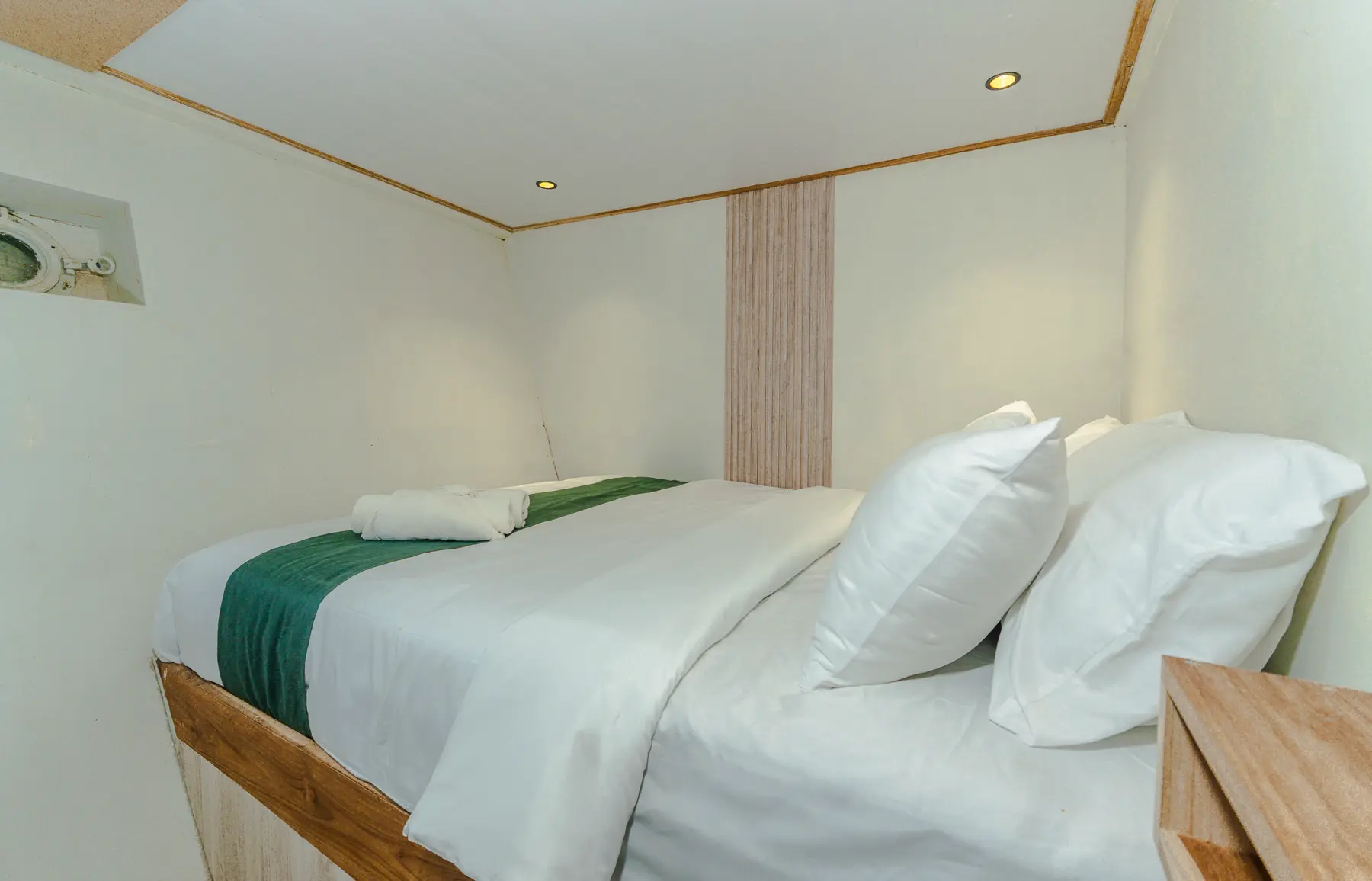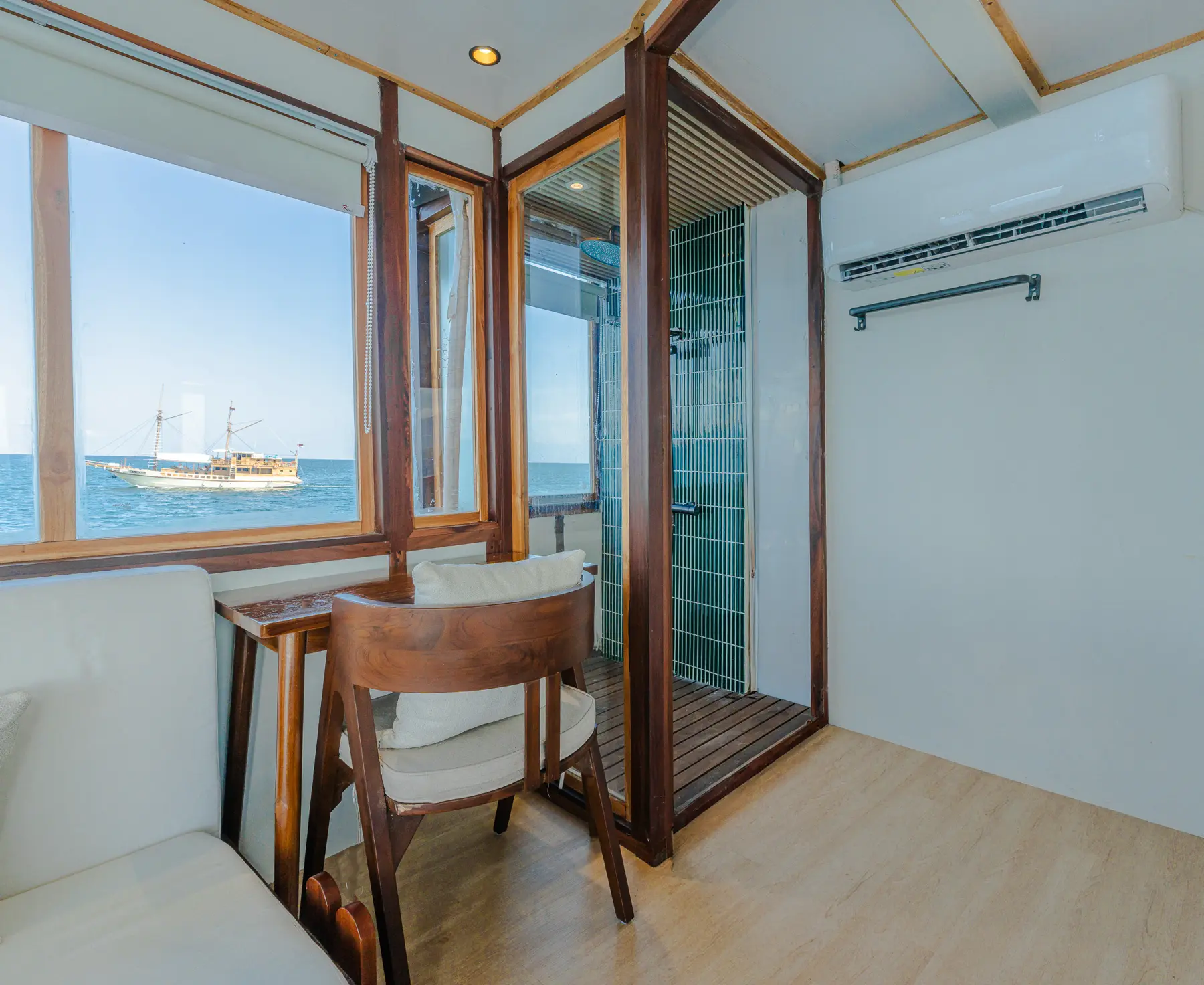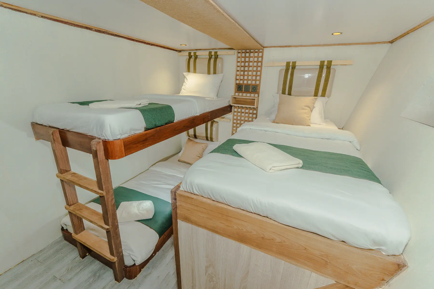 This lower-deck cabin offers three single beds and a private bathroom, making it the perfect choice for small groups or budget-conscious travelers who want to experience Komodo’s beauty with comfort and convenience.