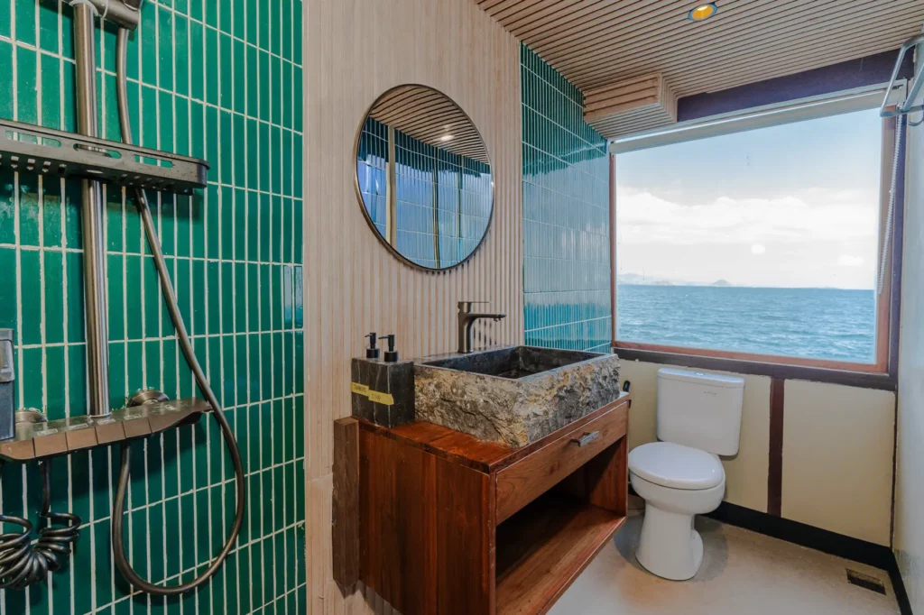 Located on the main deck, the Signature Cabin features sweeping ocean views and direct access to the outdoor lounge area. Each room includes a private balcony and ensuite bathroom, making it a favorite for guests who appreciate luxury paired with a close connection to the sea. Private bathtub coming soon.