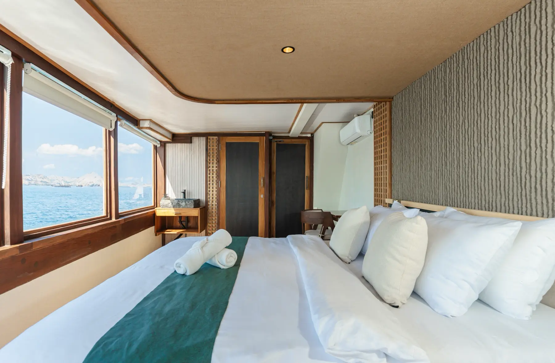 Positioned on the main deck, the Deluxe Cabin offers a charming sea view through large portholes and an inviting private bathroom. Elegant yet cozy, it’s ideal for friends or couples who enjoy a refined yet relaxed atmosphere onboard.