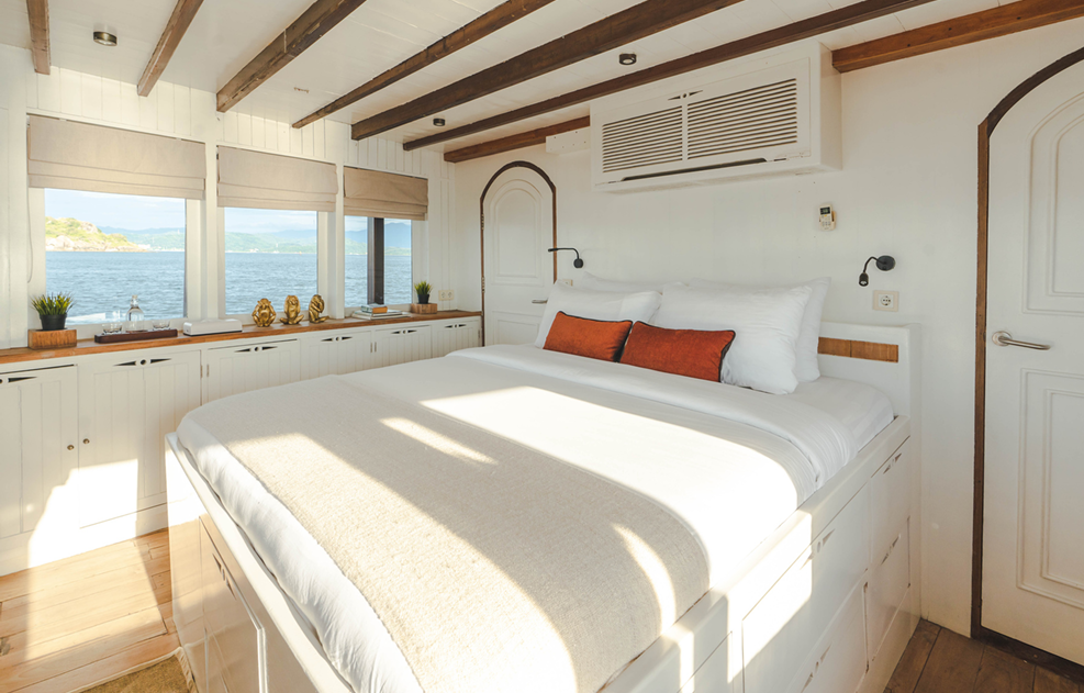 The two cabins located on the main deck offer equally luxurious amenities, including air-conditioning, wardrobe, and en-suite bathrooms.