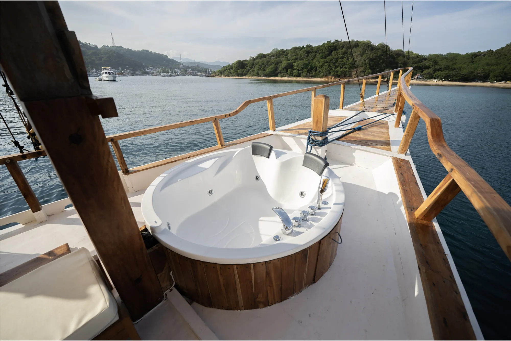 As you cruise through the picturesque waters of Komodo Island, you’ll enjoy the comforts of a spacious deck for sunbathing and a stylish dining area where delicious meals are served. The boat offers plenty of opportunities to immerse yourself in the natural beauty of the region, from snorkeling in vibrant coral reefs to soaking in the onboard Jacuzzi. Whether you’re exploring the rich marine life or simply enjoying the serene ocean views, NK Jaya 2 provides a delightful and memorable sailing experience.