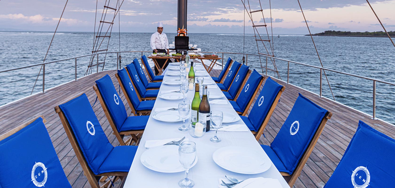 Scubaspa ZEN’s crew of 25 delivers exceptional personal service to guests. There are multilingual dive crew, two spa therapists, a yoga master, and two chefs. The yacht boasts two masted decks for sunset cocktails, outdoor dining, and stargazing in the open-air cinema.
