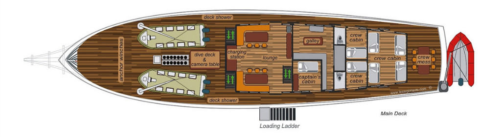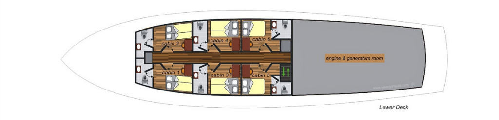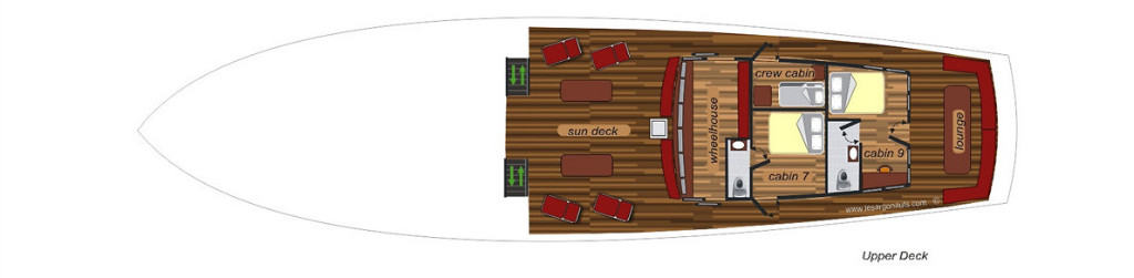 The cabins, main dining room, and deck areas are wonderfully arranged. The four double & four twin rooms are finished to a high standard, are all equipped with air conditioning, and come with king-size beds in the doubles and large single beds in the twins. Two double cabins are on the upper deck, offering breathtaking ocean views.