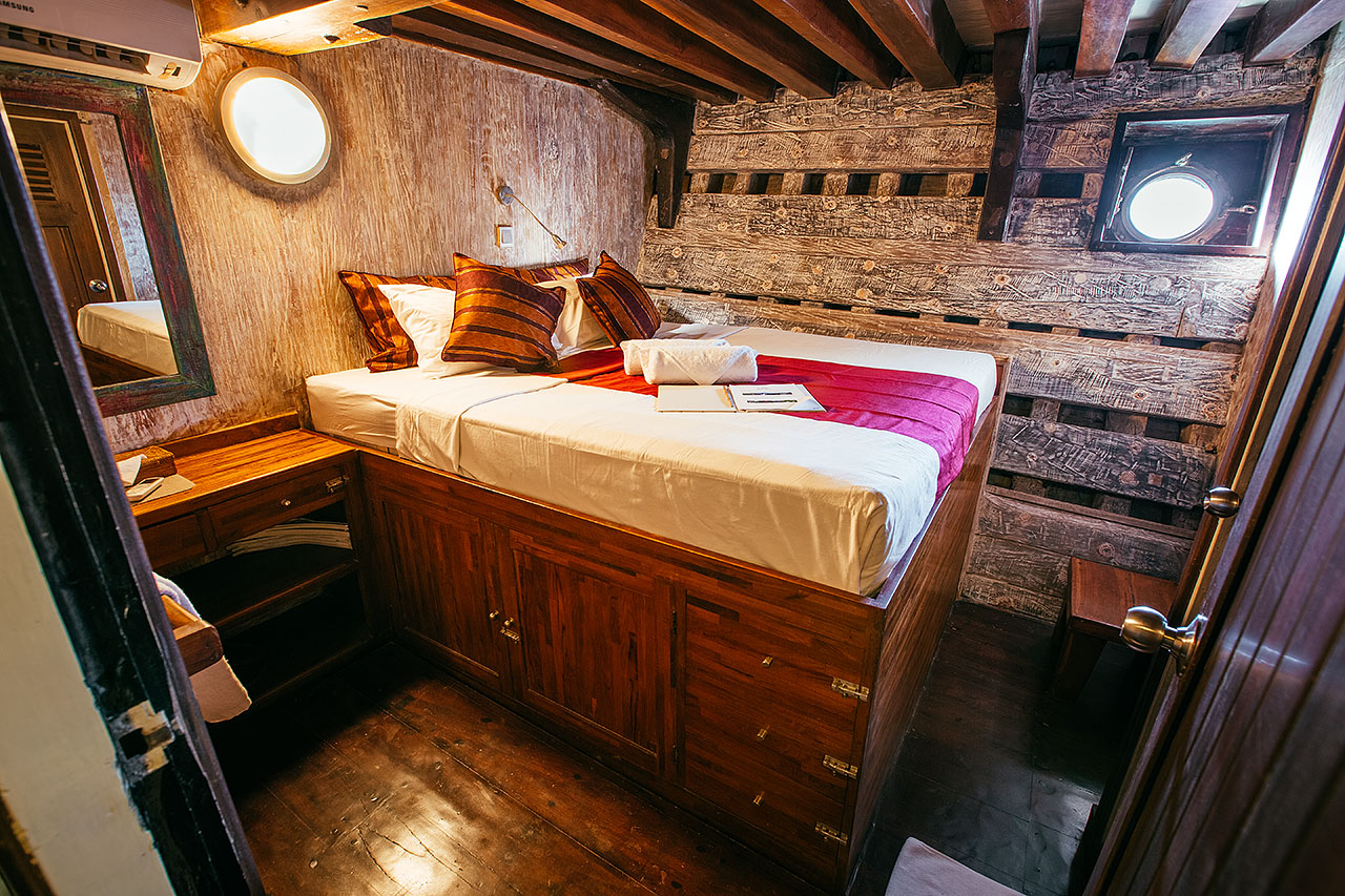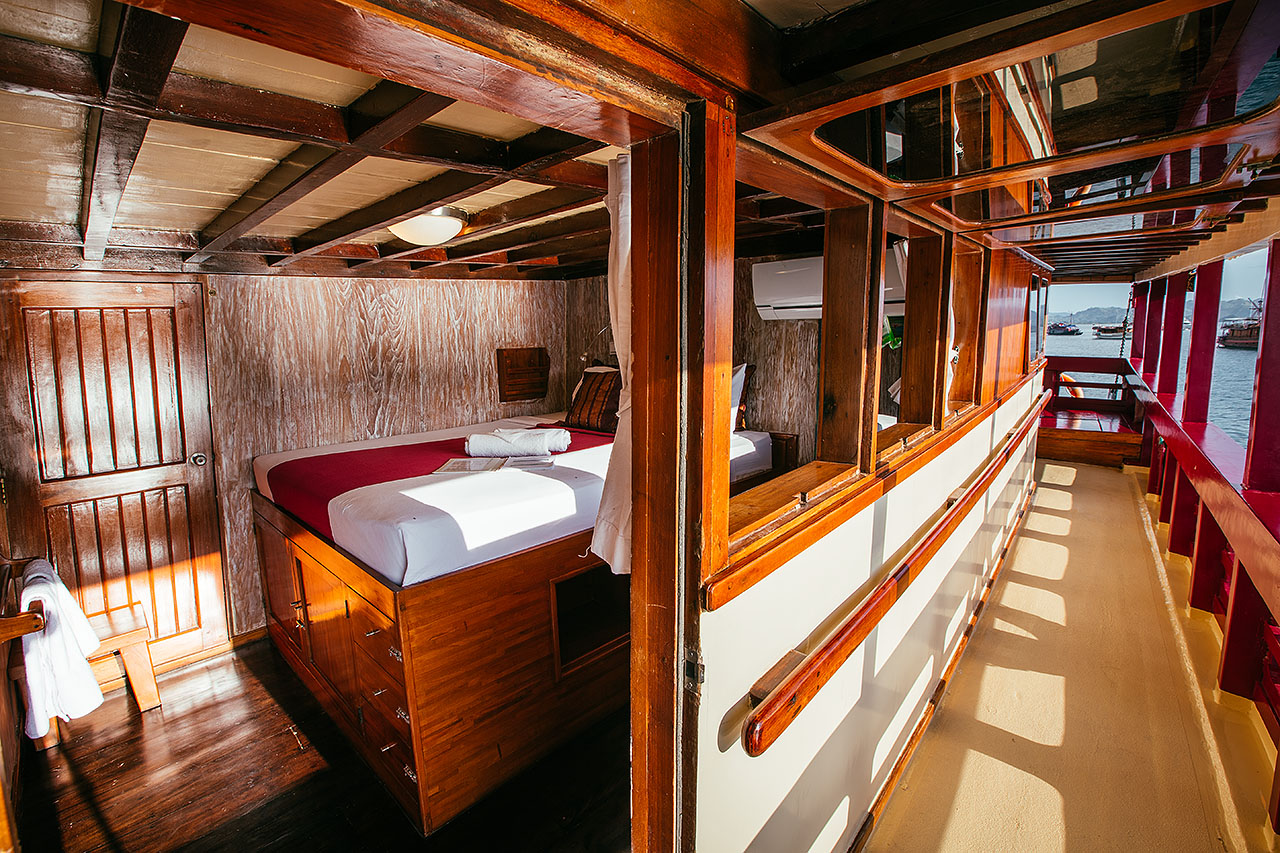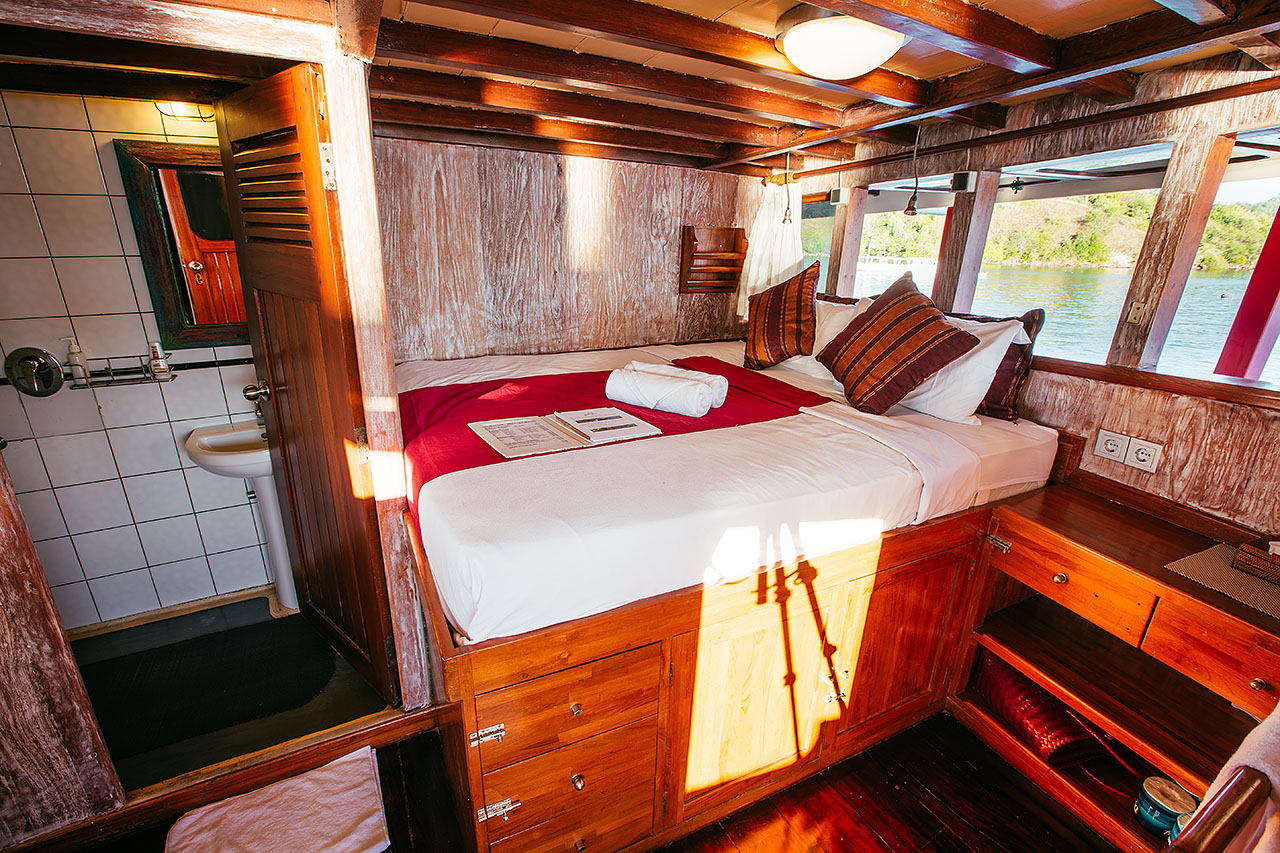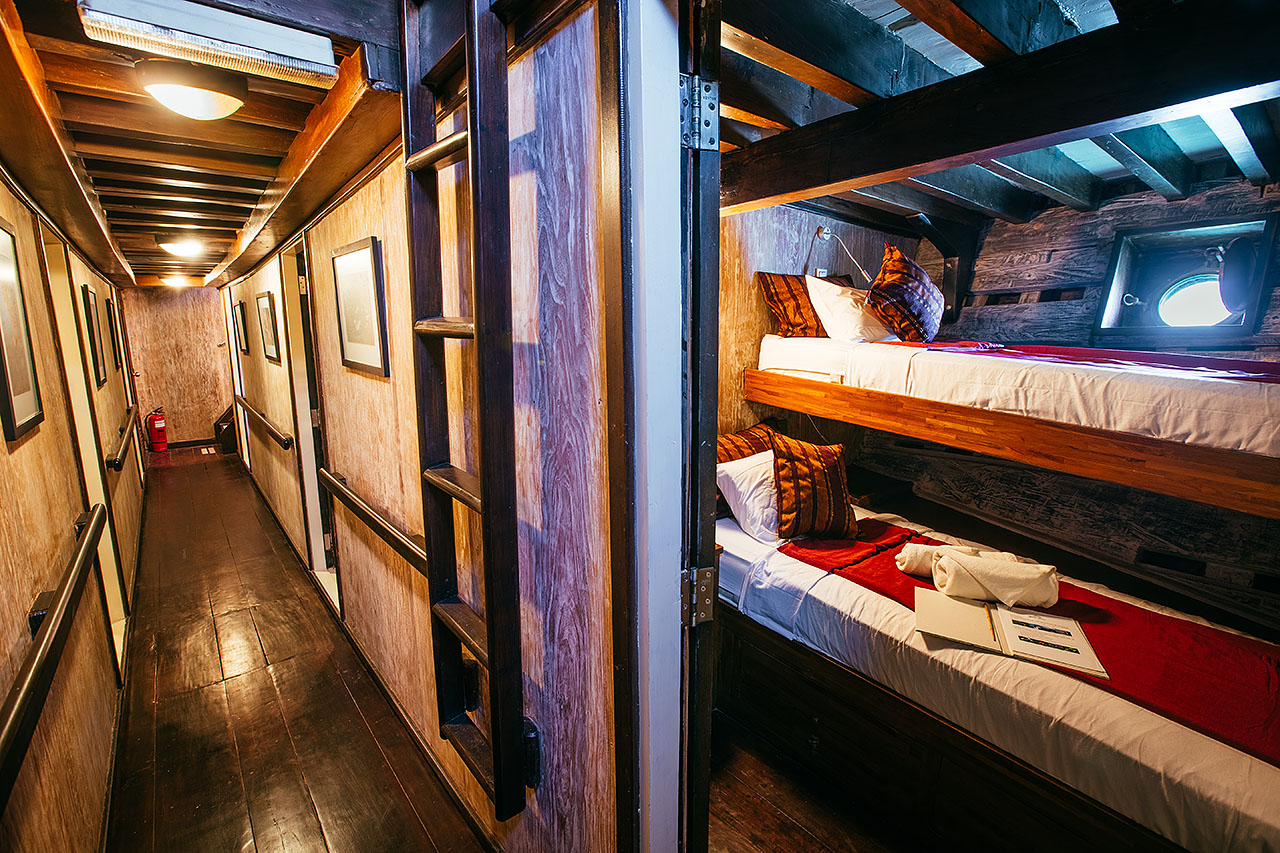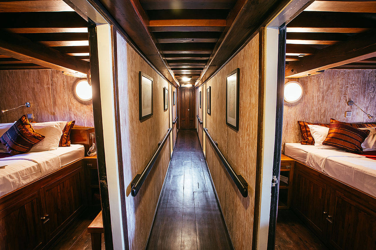 The cabins, main dining room, and deck areas are wonderfully arranged. The four double & four twin rooms are finished to a high standard, are all equipped with air conditioning, and come with king-size beds in the doubles and large single beds in the twins. Two double cabins are on the upper deck, offering breathtaking ocean views.