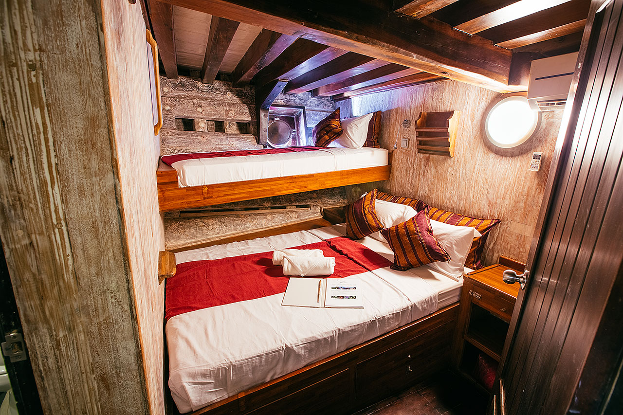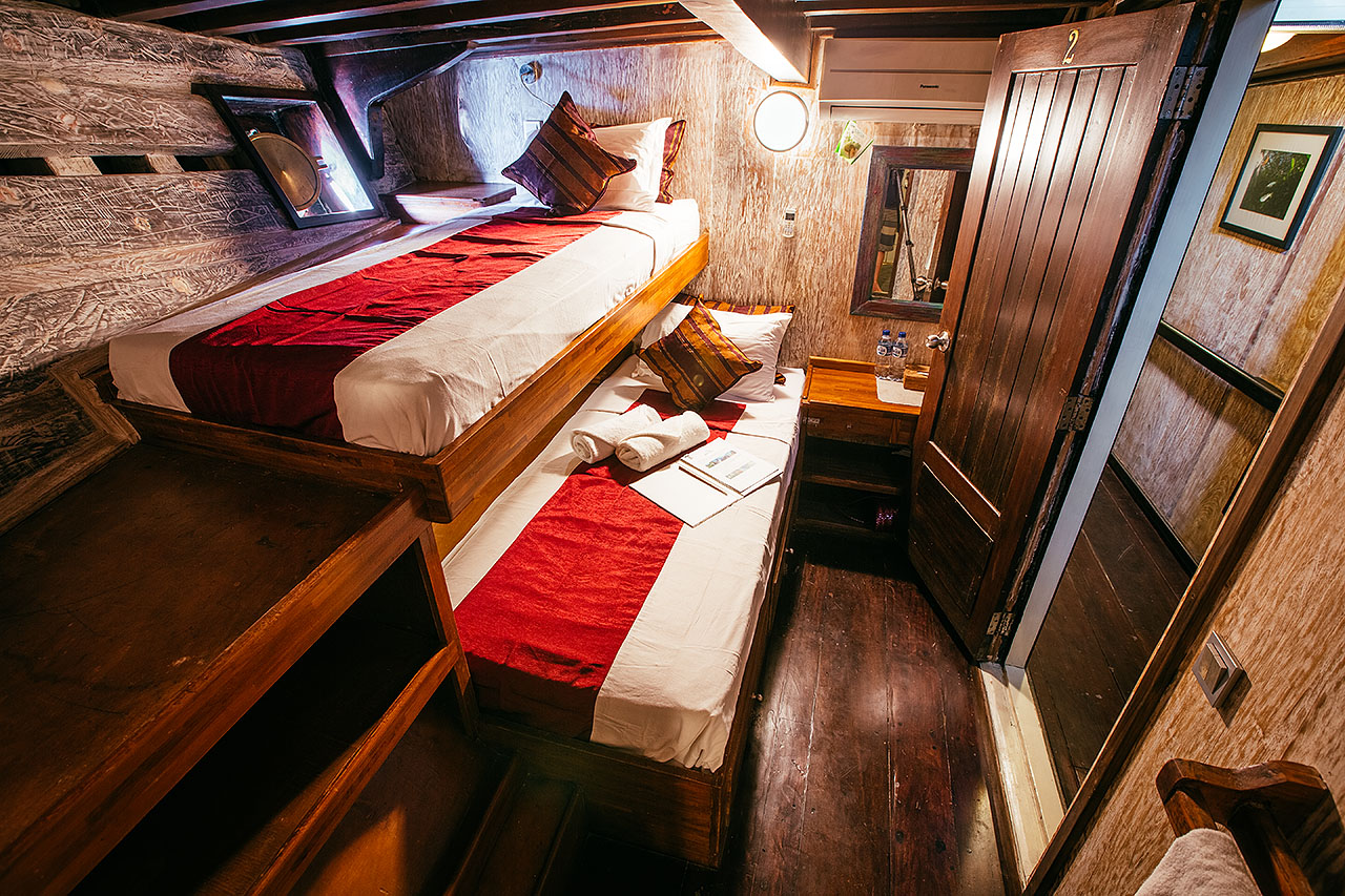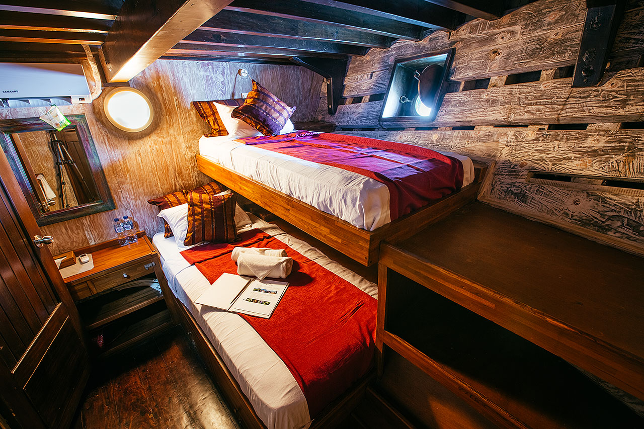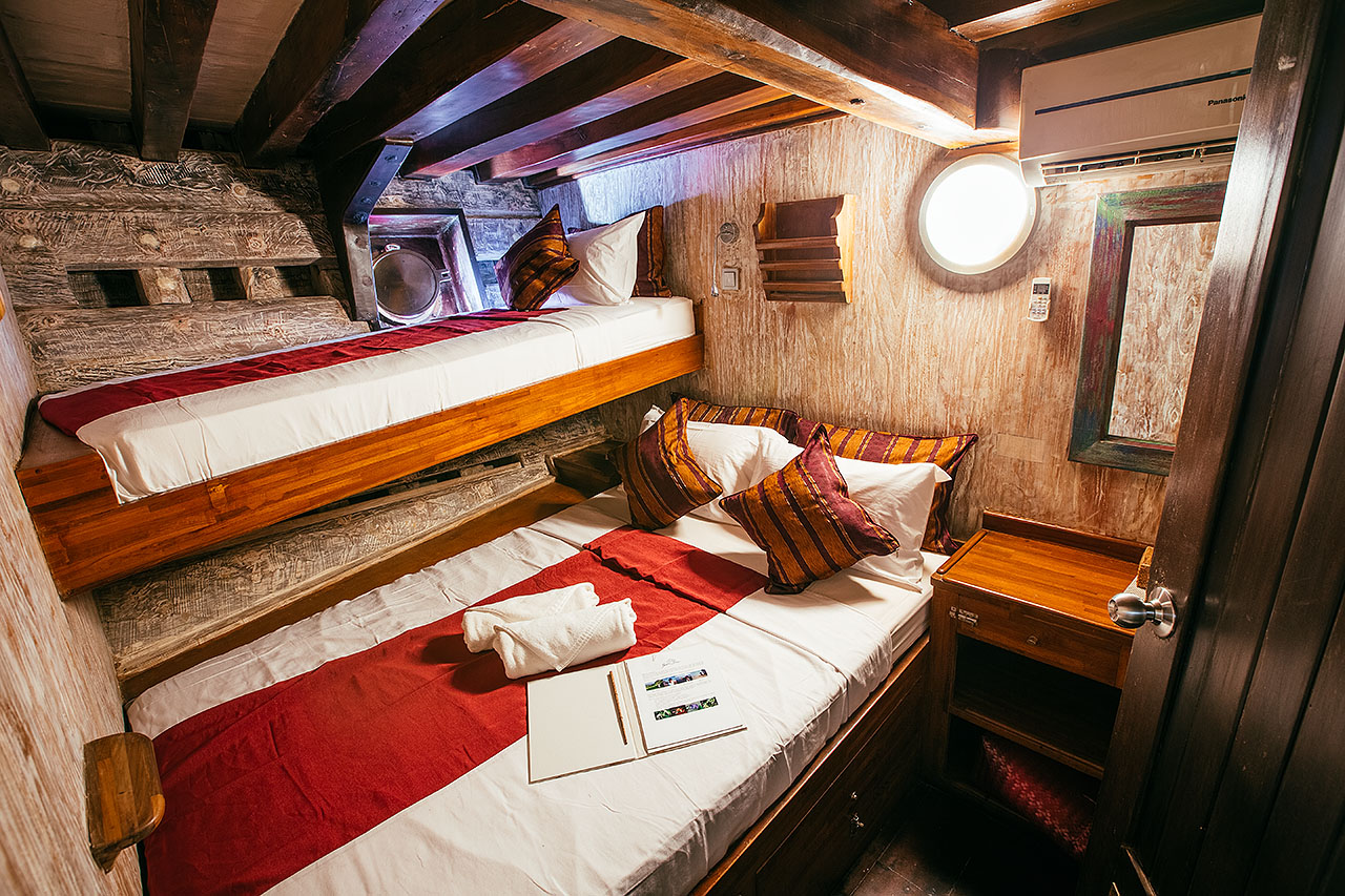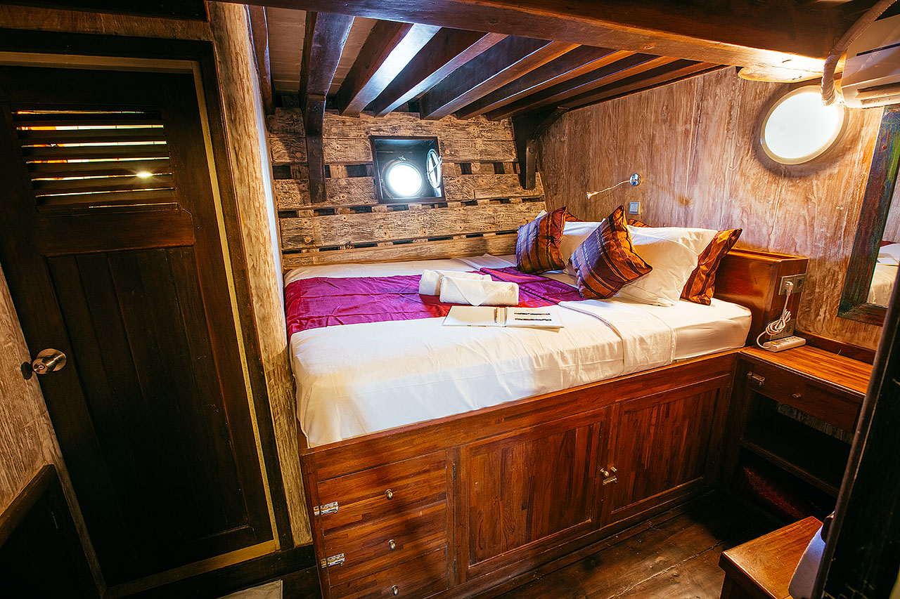 The cabins, main dining room, and deck areas are wonderfully arranged. The four double & four twin rooms are finished to a high standard, are all equipped with air conditioning, and come with king-size beds in the doubles and large single beds in the twins. Two double cabins are on the upper deck, offering breathtaking ocean views.