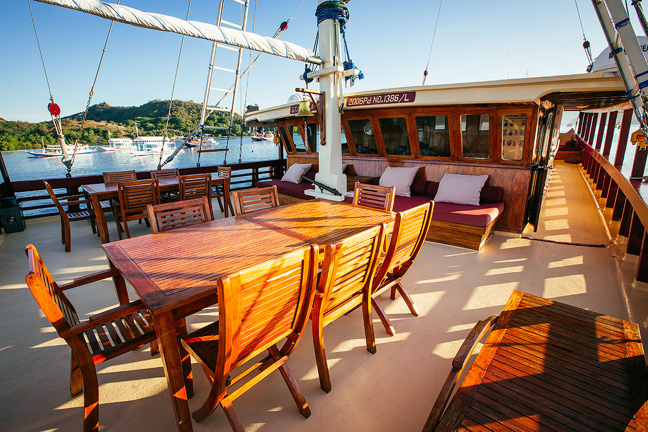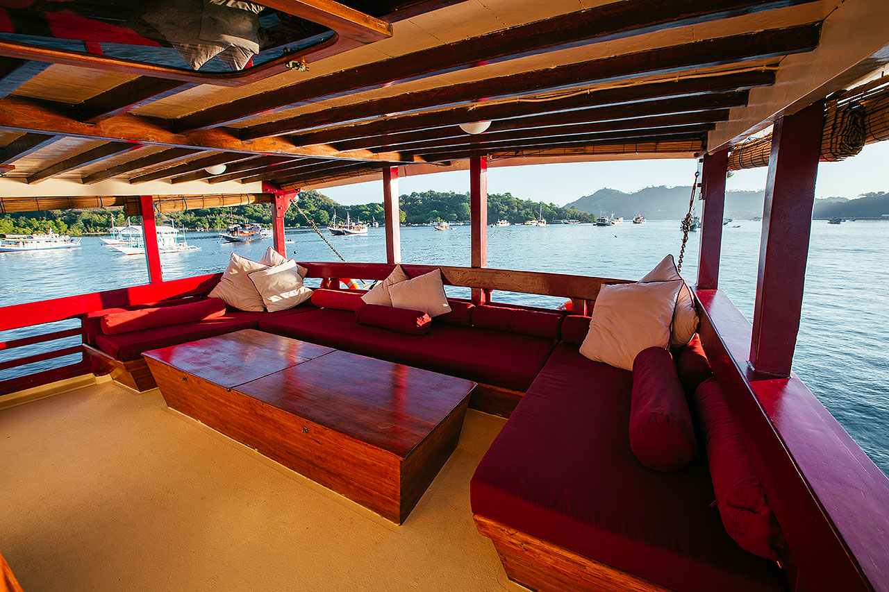 The main lounge and inside dining areas is fully air-conditioned, but all windows can be fully opened to let the breeze through, which is usually the nicest experience. A shaded lounging area aft on the upper deck, as well as shaded lounge beds in front of the wheelhouse are great areas for sunsets and cocktails.