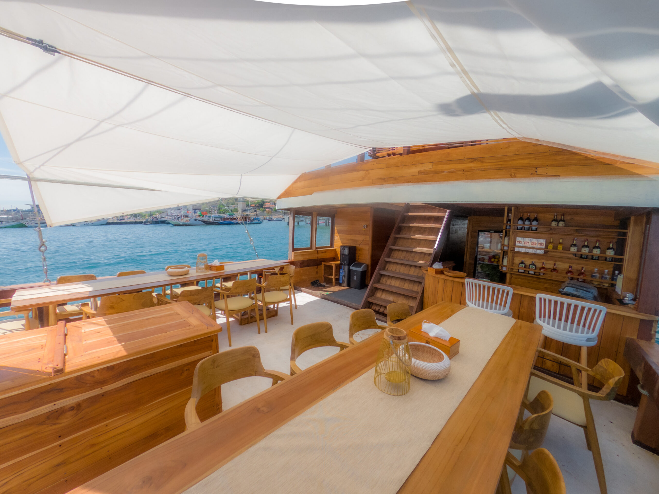 The Yumana Liveaboard is a classic-style Phinisi Boat built in 2021 by local craftsmen. It features an ironwood base and a hard teak wood upper structure. With a length of 32 meters and a width of 6 meters, it accommodates up to 25 guests. The Yumana offers various cabin options, including a master cabin with a balcony and jacuzzi. Onboard amenities include bean bags, a sun deck, and a jacuzzi. It’s an excellent choice for exploring Labuan Bajo and Komodo National Park.